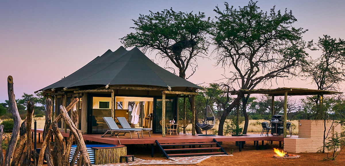 Set on stilts and nestled underneath Camel-thorn Trees amidst the red Kalahari sand, Camp Kalenga’s spacious safari tents feature canvas walls and a thoughtfully designed open-plan layout. Each tent consists of a King sized Bed, en-suite bathroom facilities and its own private deck with heated splash pool overlooking the Kalahari landscape.